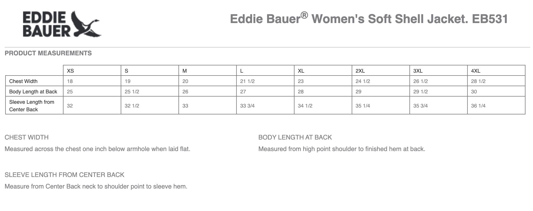 - Contrast heat transfer Eddie Bauer logo on right hem